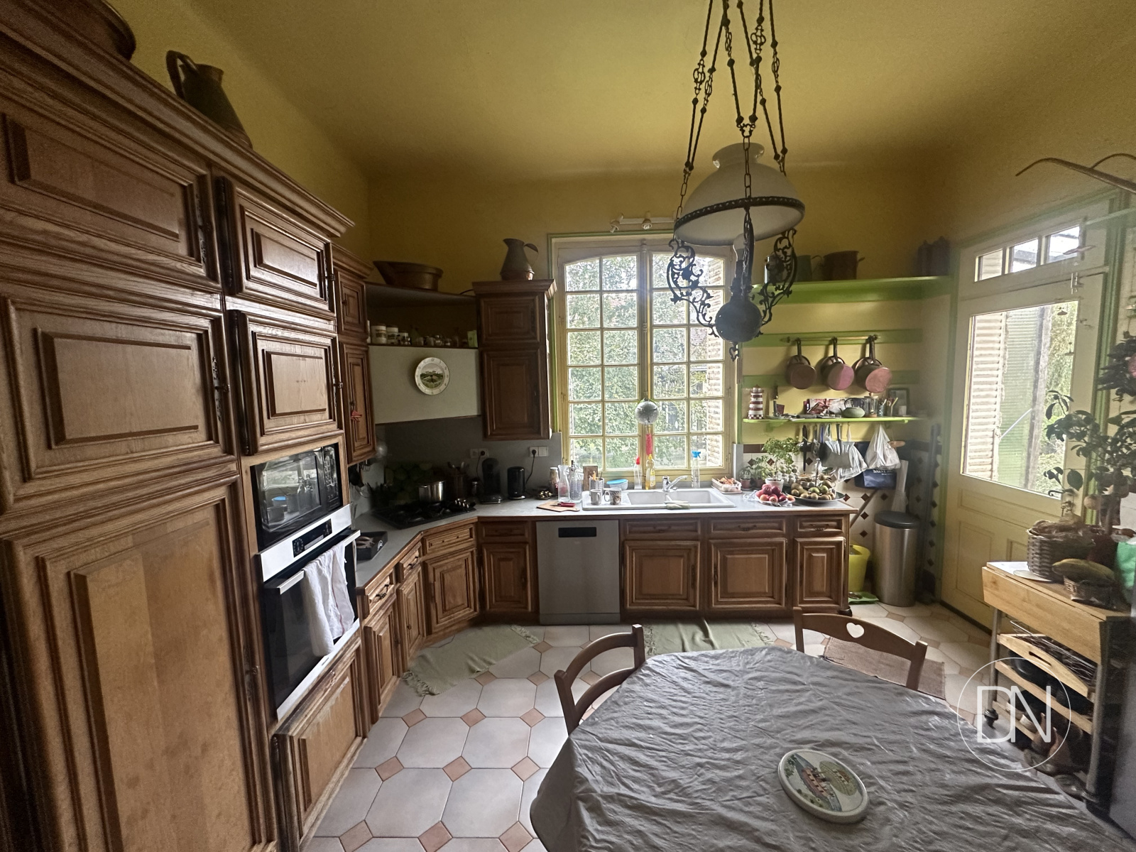 Aménagée et équipée. Accès vers l'office, la terrasse sud et l'escalier de service vers le 1er étage.