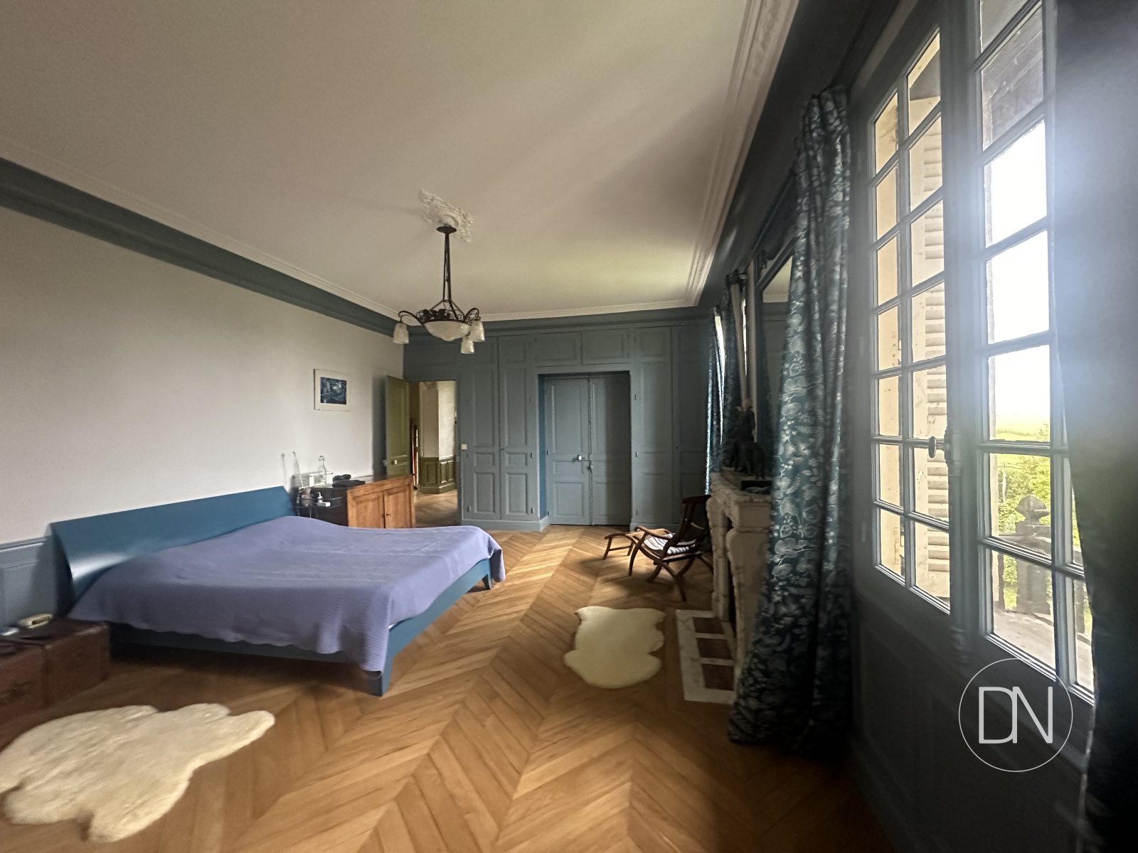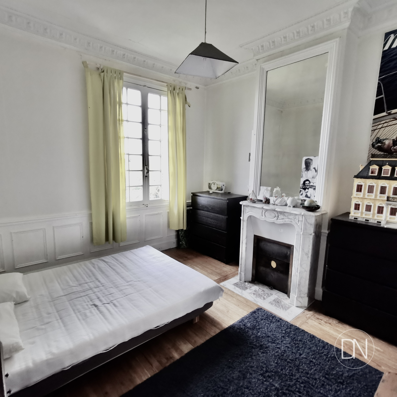 Cheminée et placards. Accès vers la chambre 2, le palier, le dégagement vers la salle de bains et la salle d'eau.