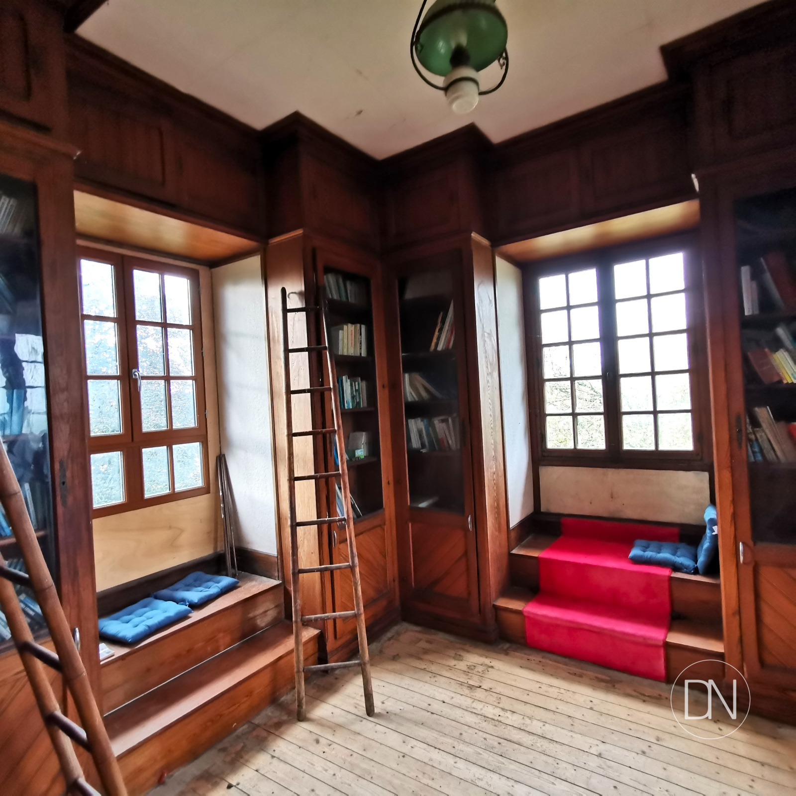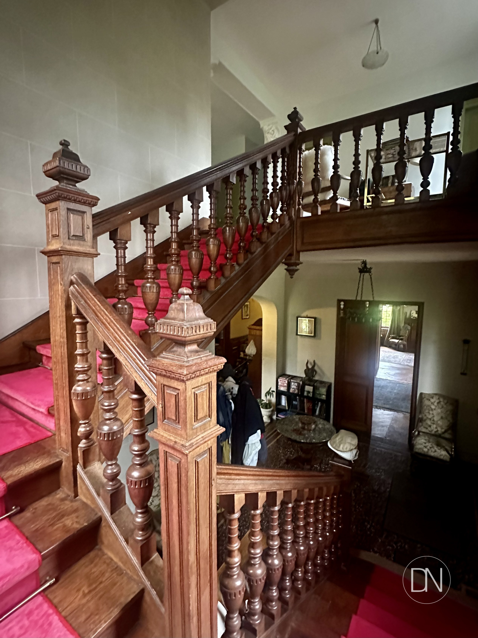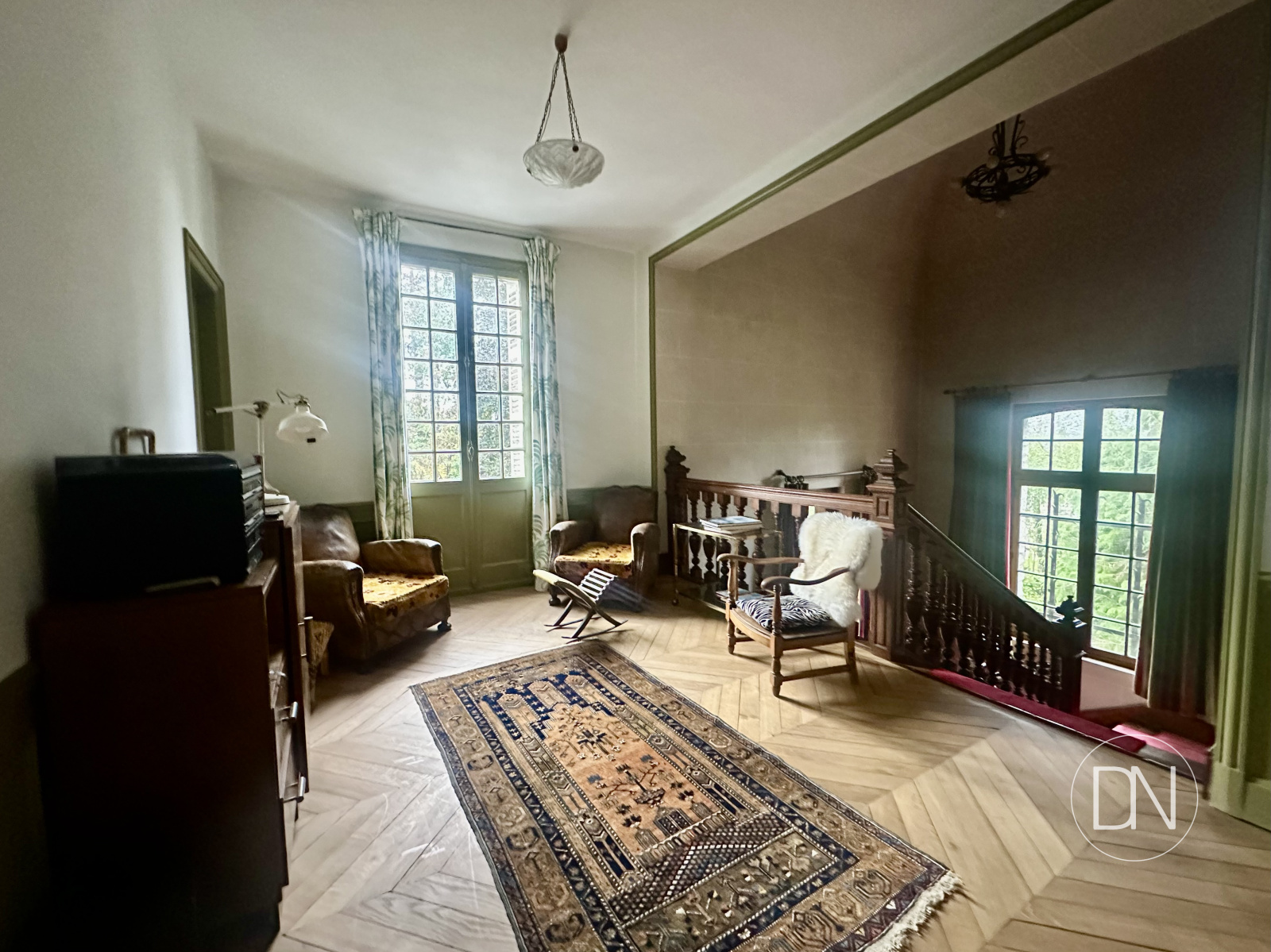 Vue à 360°. Accès escalier vers bibliothèque.
