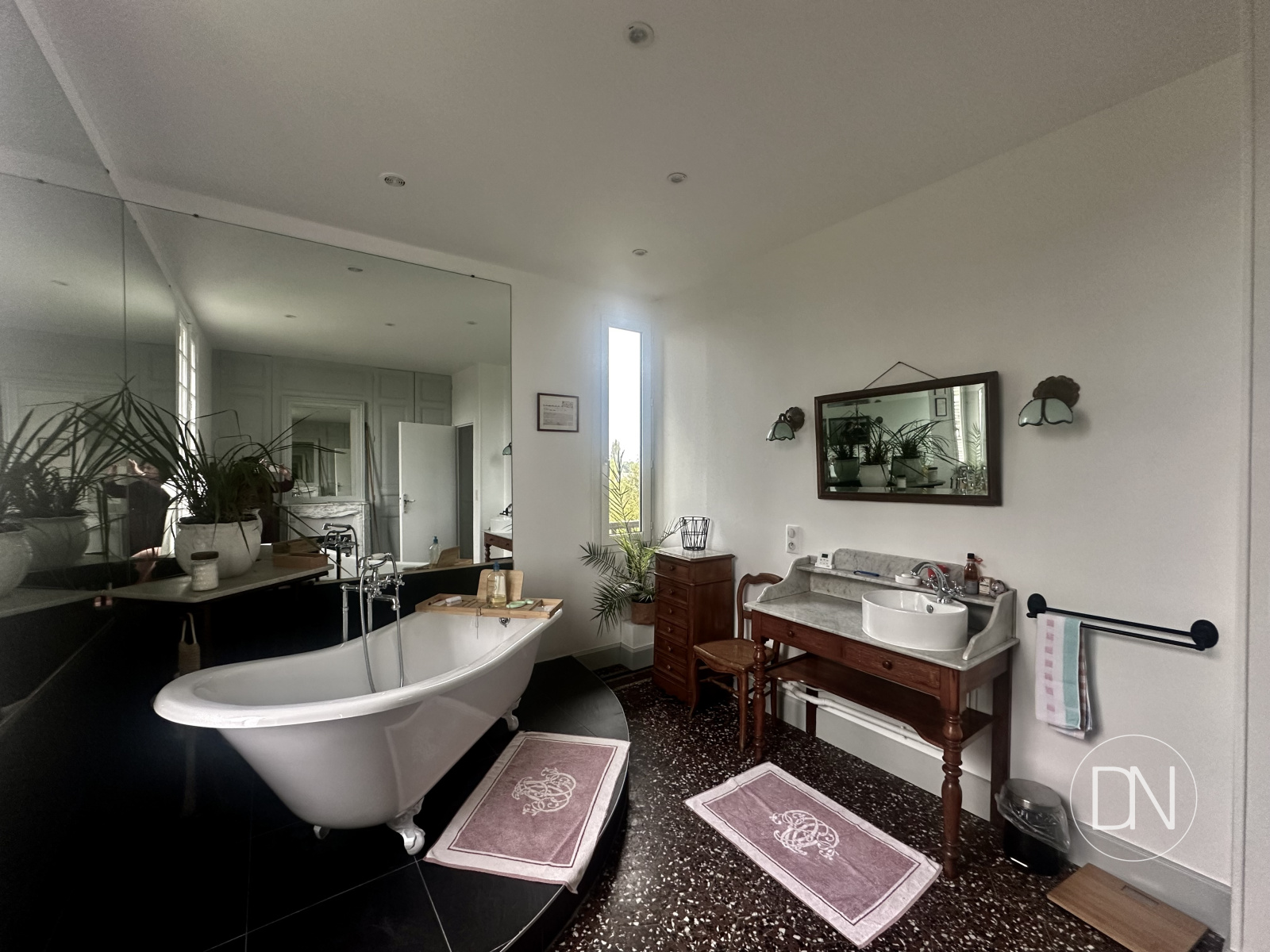 Baignoire pieds têtes de lions, meuble vasque accès vers le dégagement (couloir)