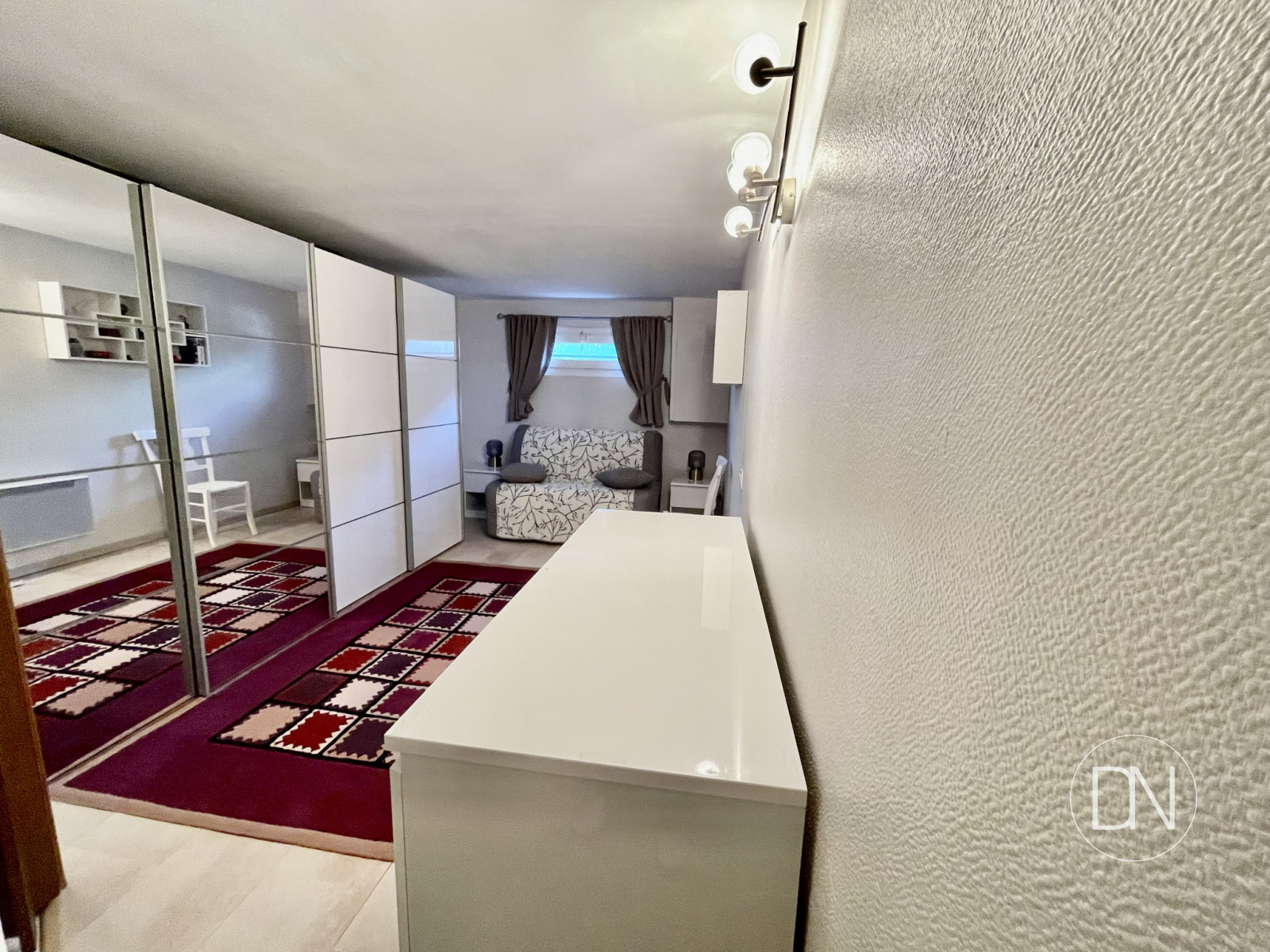 Entrée avec chambre/bureau dans le prolongement, ouvert sur le jardin, carrelage au sol