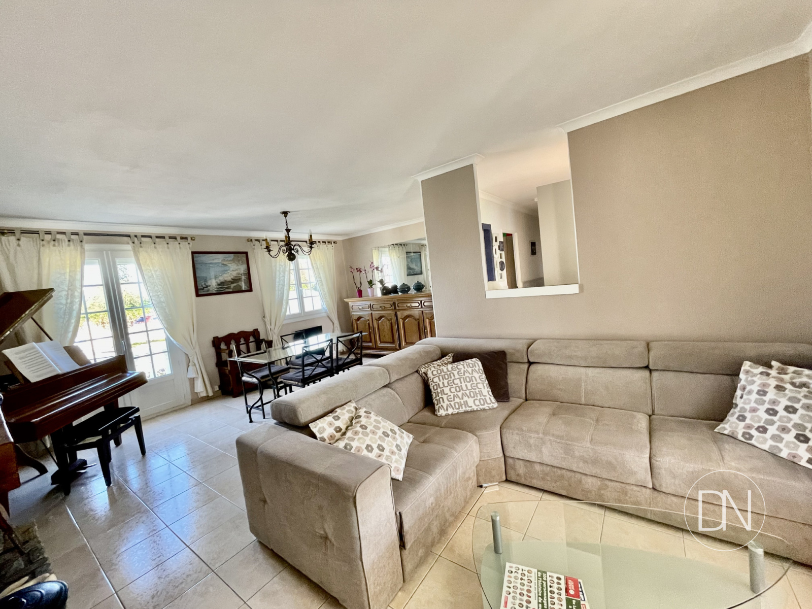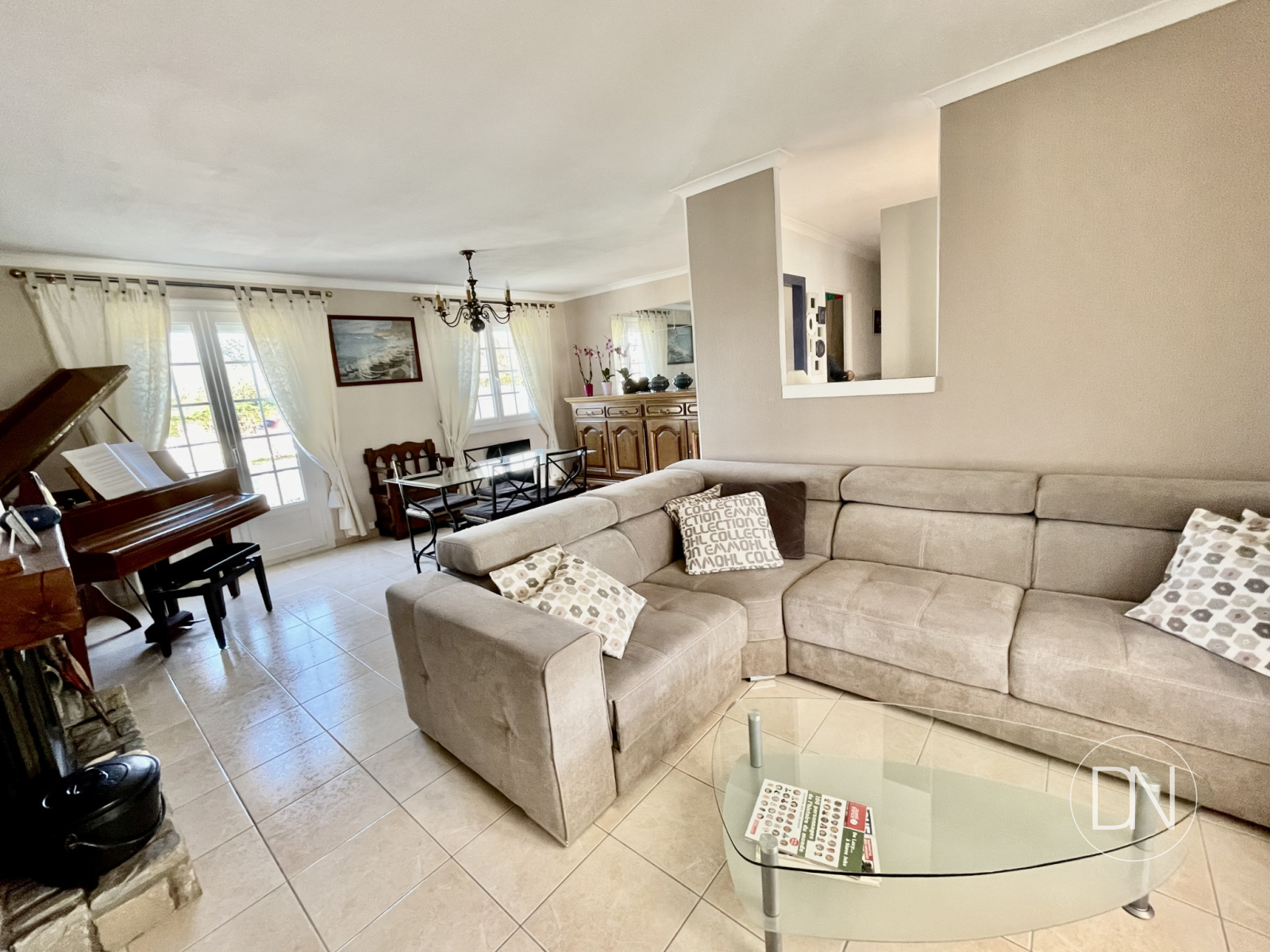 cheminée-insert, carrelage au sol. Accès à la véranda. Terrasse côté nord