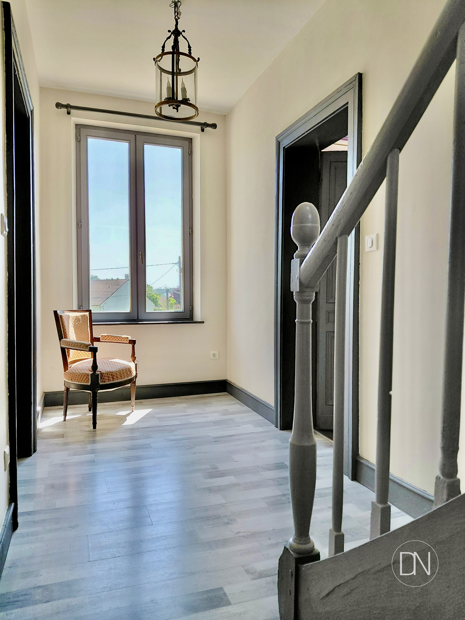 carrelage, cheminée factice, accès à la chambre 1 à l'étage