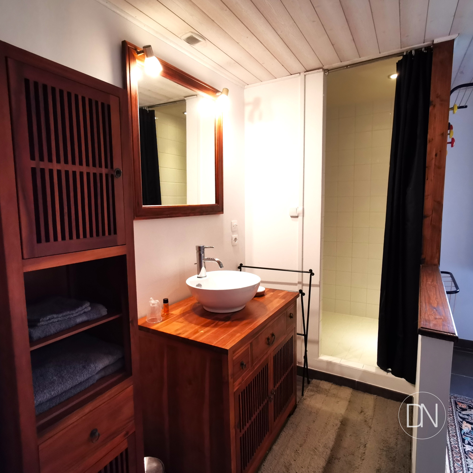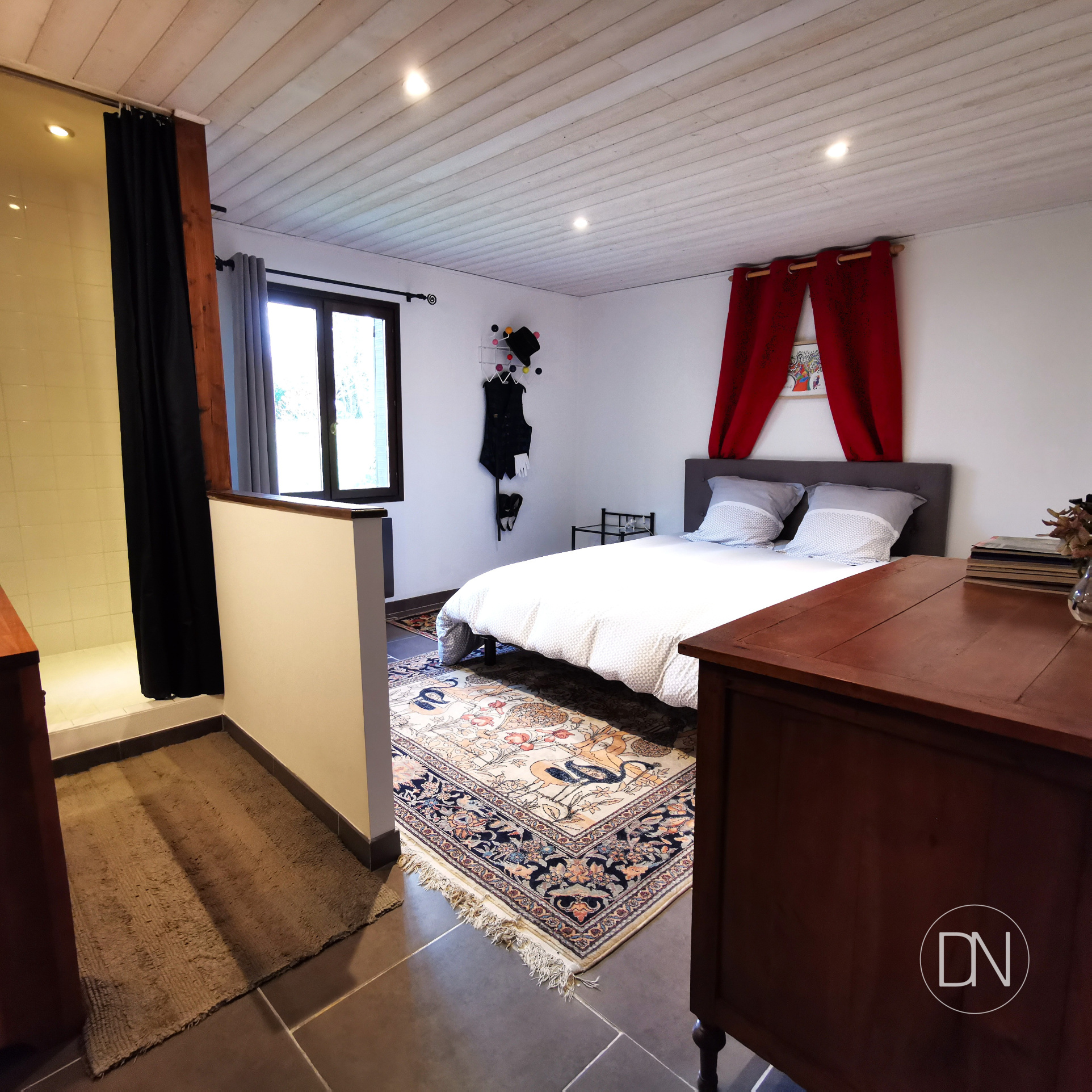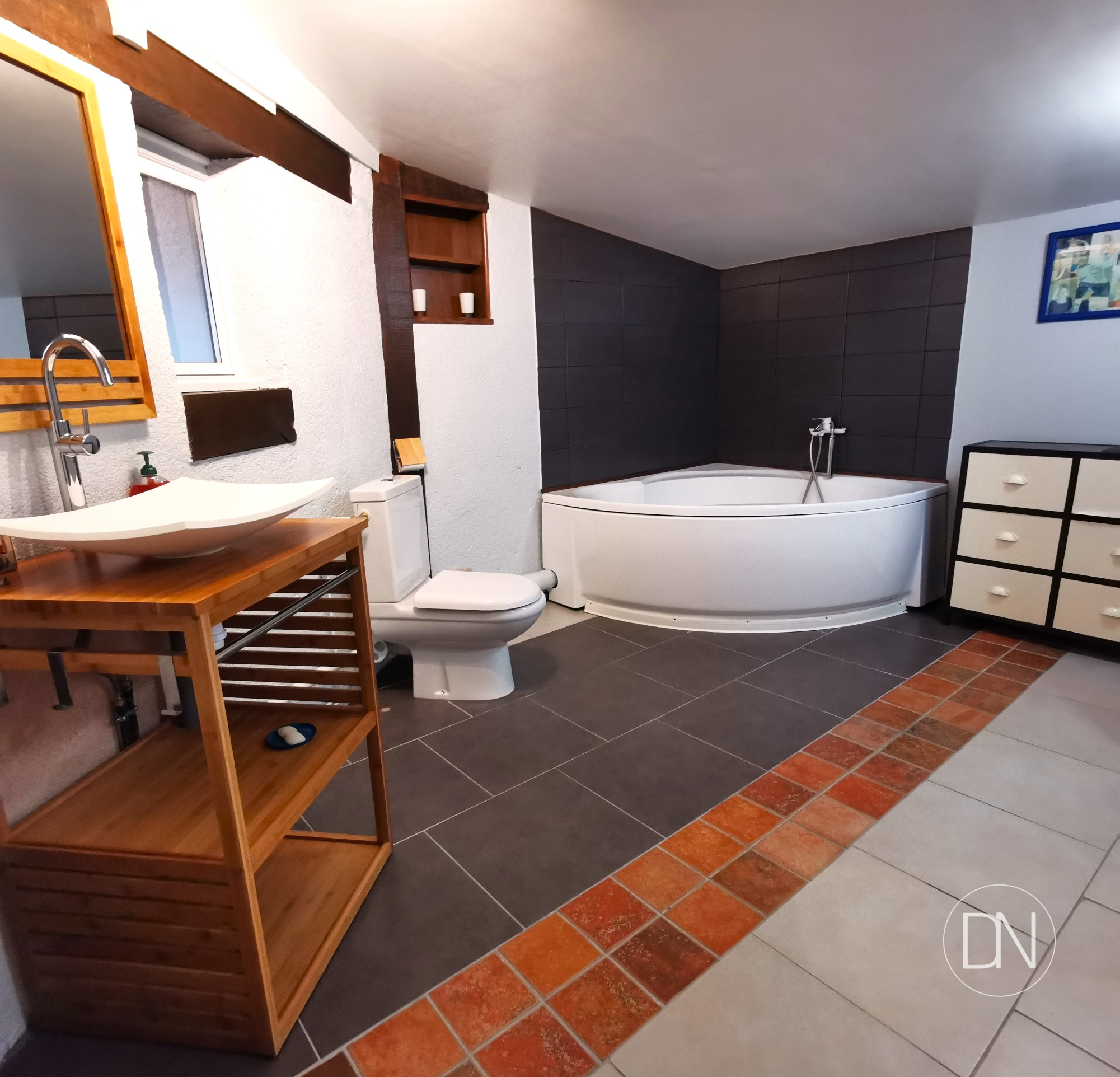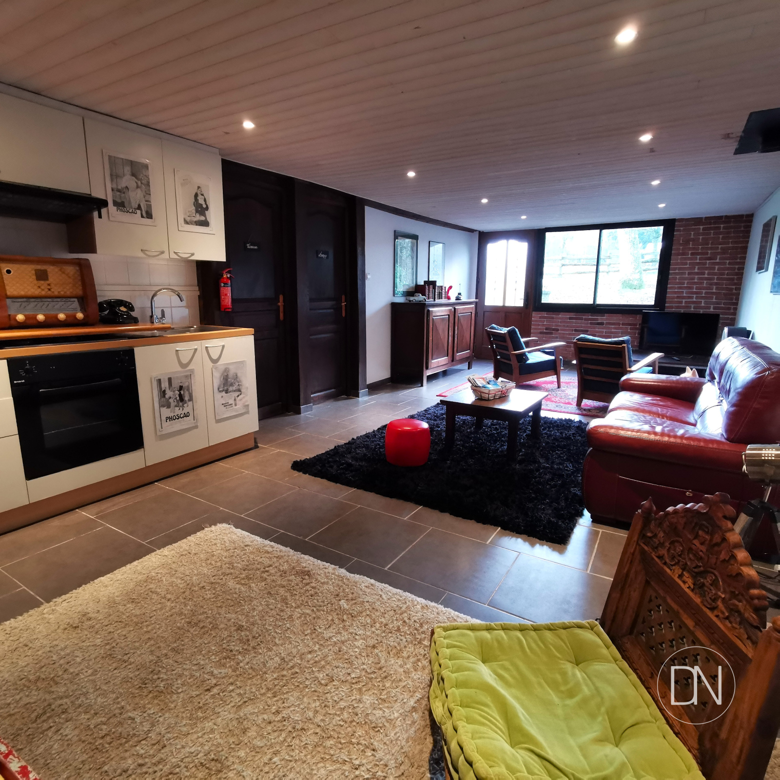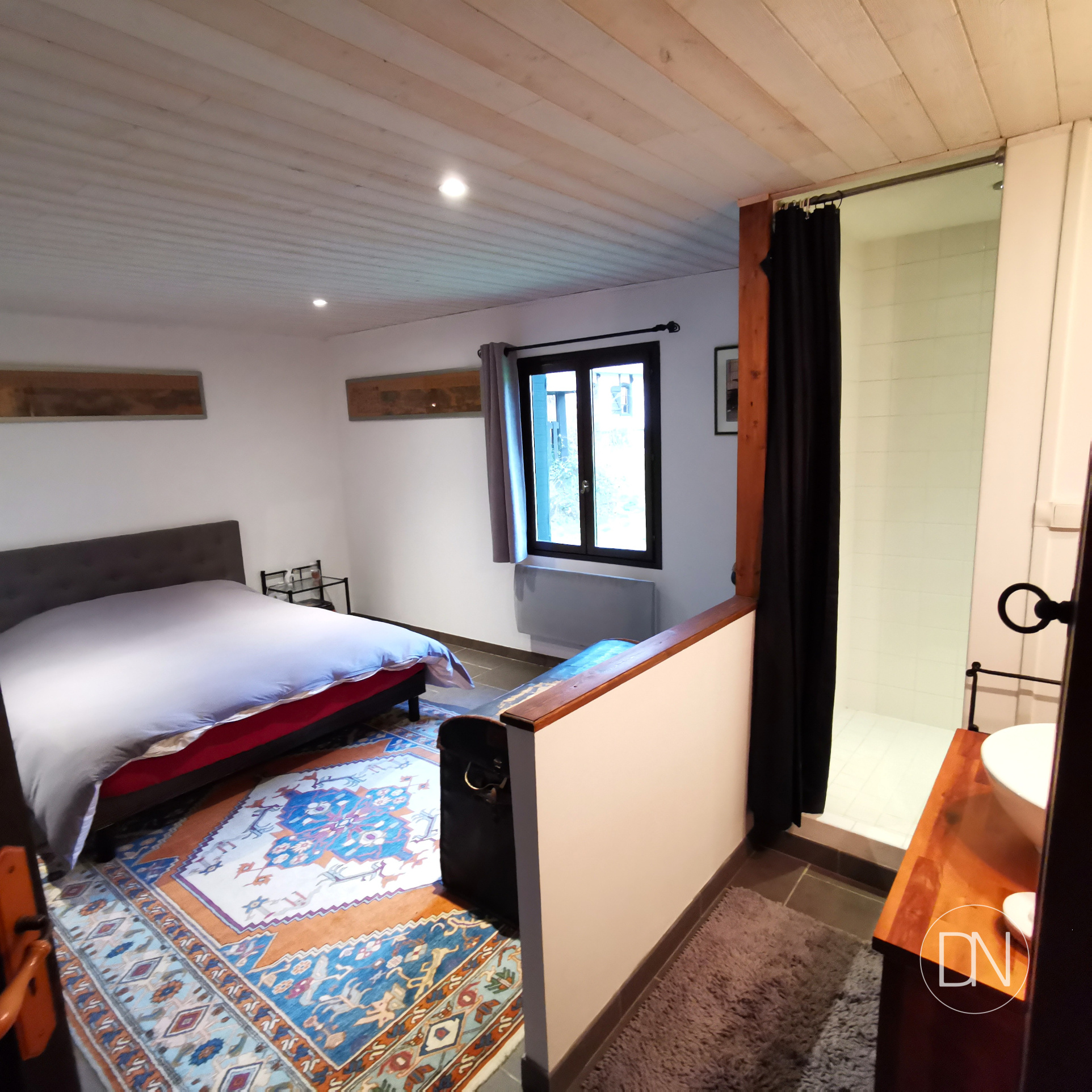 La dépendance, totalisant 105 m² habitables de plain-pied, distribue une entrée, un séjour avec un coin cuisine aménagée et équipée, un WC, 2 chambres avec coin salle d’eau et une suite parentale avec salle de bains avec WC.