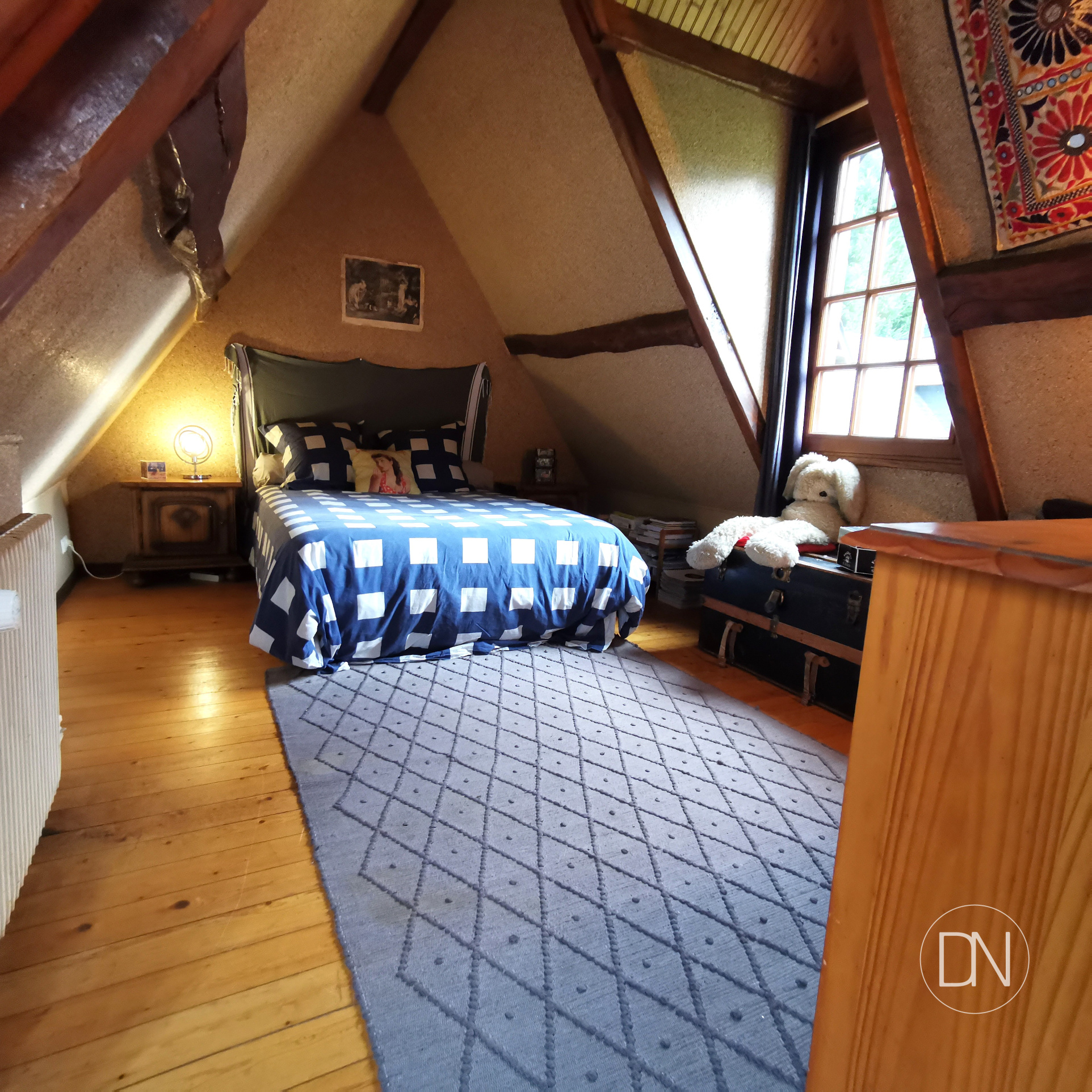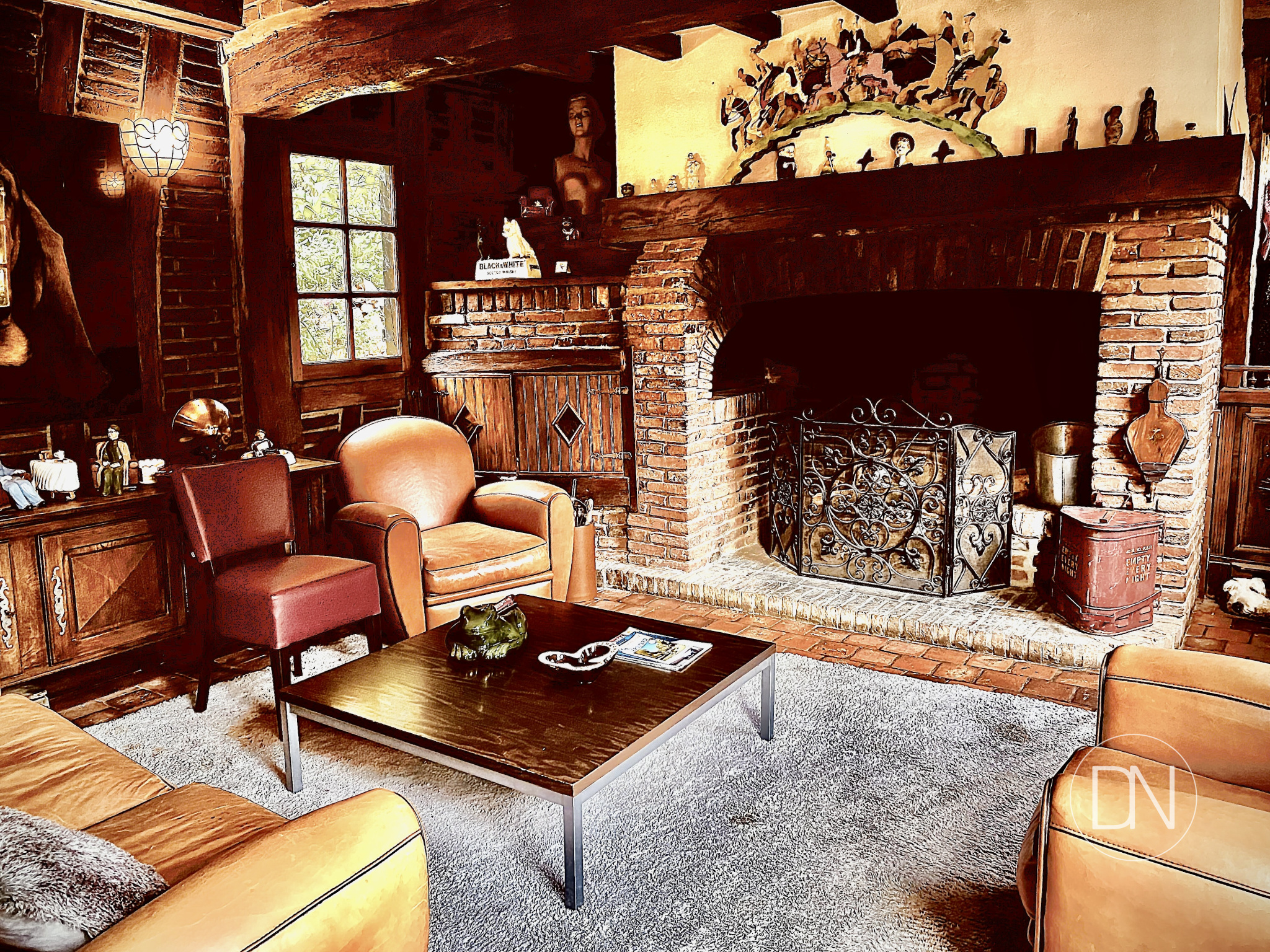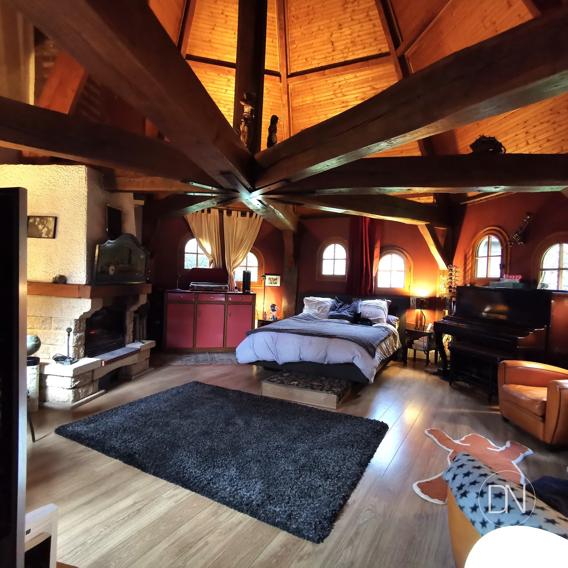 La propriété s'entoure d'un parc joliment paysagé et arboré sur 3000 m² avec un verger sur une prairie de 4000m², avec un accès direct dans la forêt. La maison principale, se compose de 2 longères qui ont été réunies par une pièce hexagonale. Le rez-de-chaussée se compose d'une entrée, de deux espaces de vie (139 m² au total), exposés Sud et Ouest, avec deux cuisines aménagées et équipées, un salon (pièce hexagonale de 36 m²) avec une cheminée équipée d’un insert, d’une salle à manger ouverte sur la cuisine, une seconde salle à manger avec un poêle à bois, d'un salon de 20m² avec une cheminée ouverte avec four à pain. Un dégagement, une buanderie, une salle de bains et 2 WC complètent ce niveau. Au 1er étage un palier dessert 2 chambres et une suite parentale (34m²) avec salle de bains et WC et un balcon sous la queue de geai.