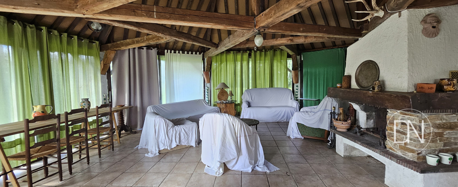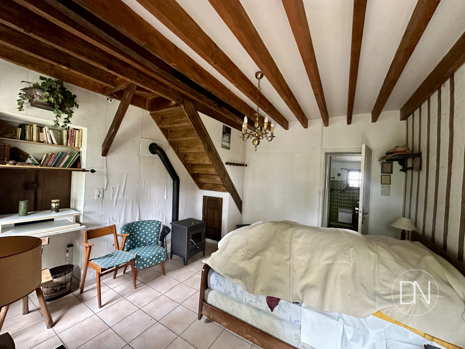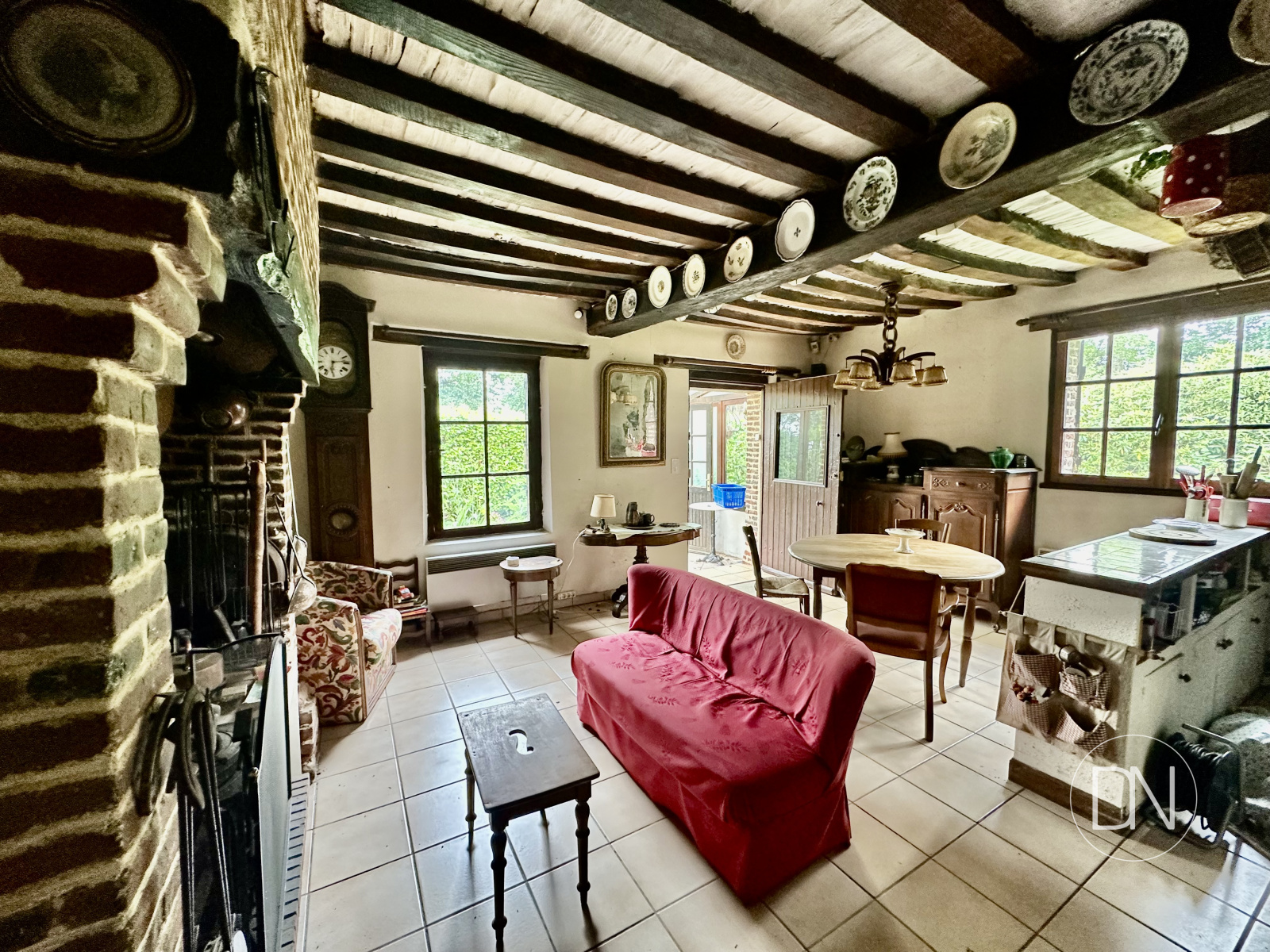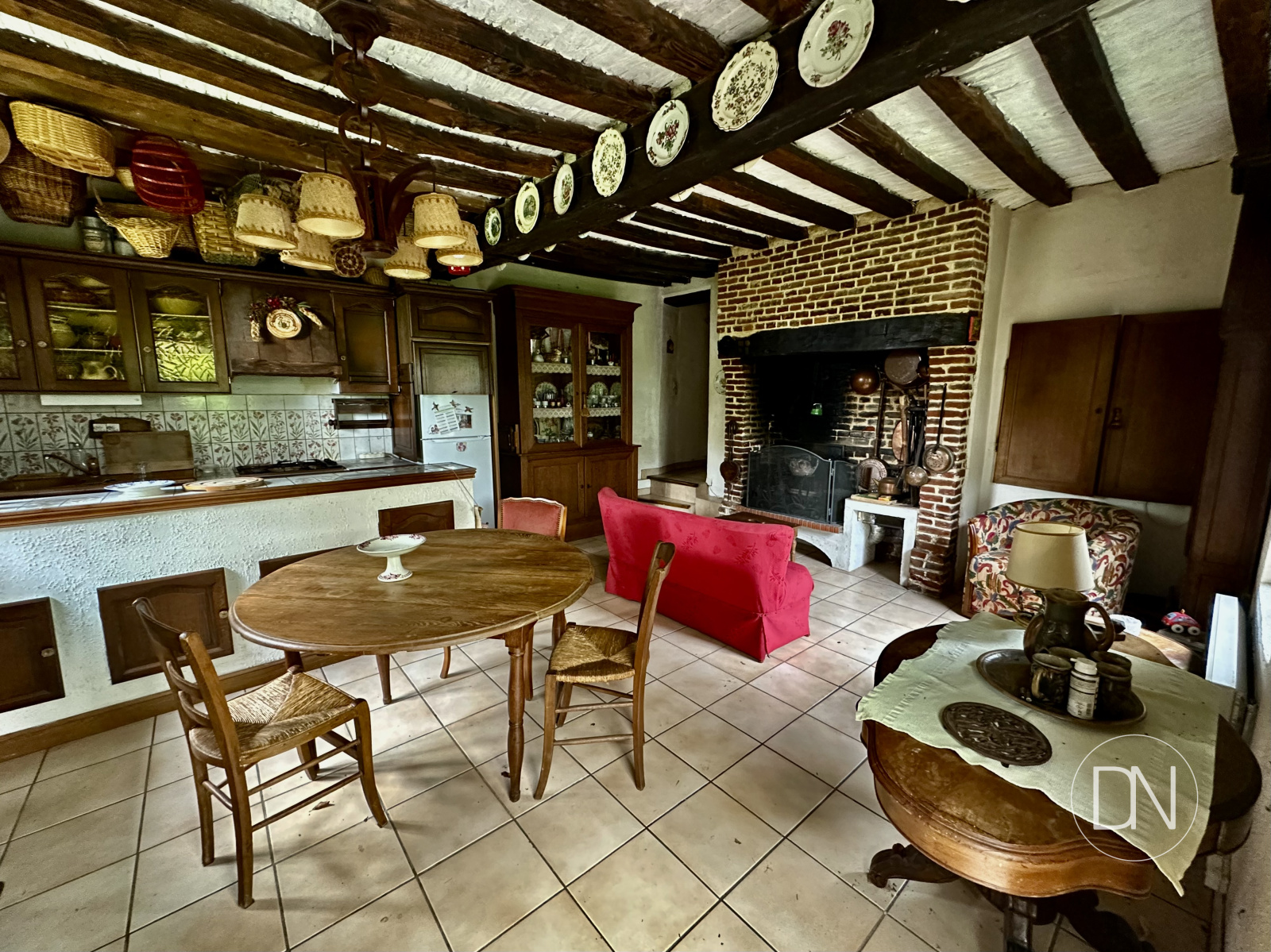 Cheminee en pierre et cuisine ouverte. Accès terrasse