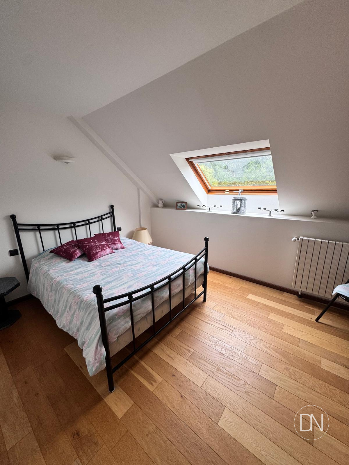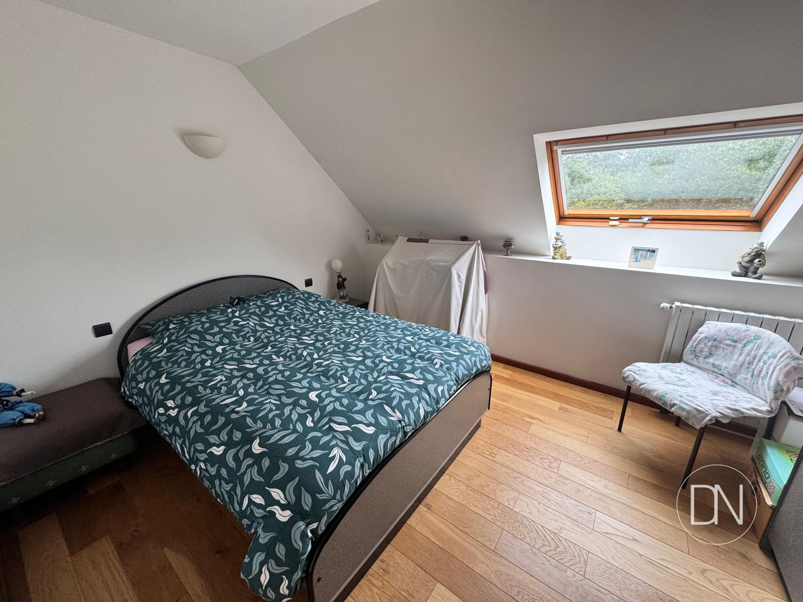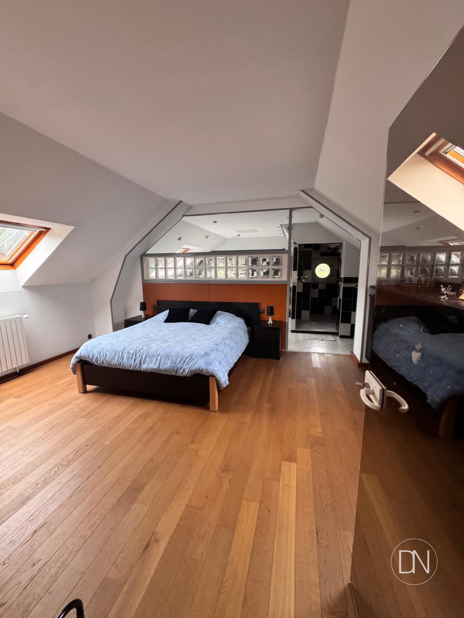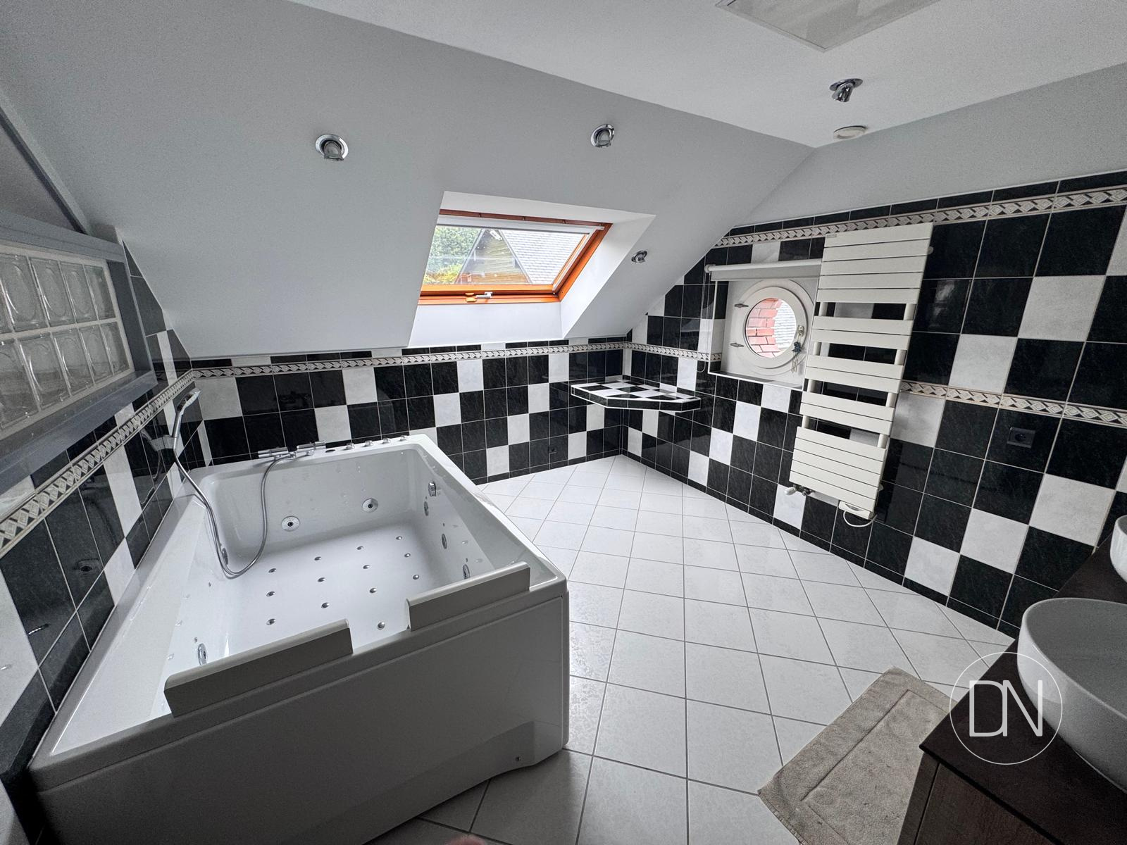 À l’étage, la mezzanine, actuellement en espace bureau, vous offre une vue plongeante sur le salon. Elle dessert à gauche une deuxième suite parentale avec sa salle de bain balnéo et son espace douche. A droite un long couloir avec placards desservant trois chambres, un wc et une salle de bain.