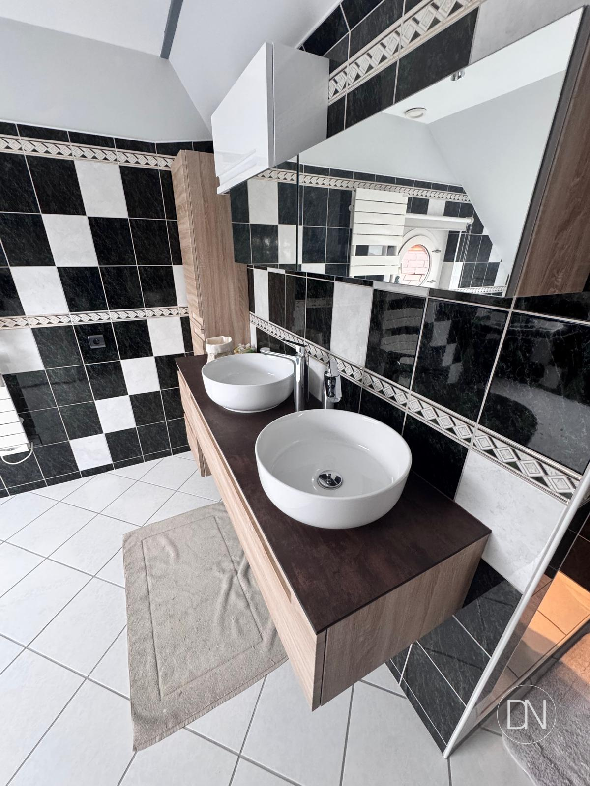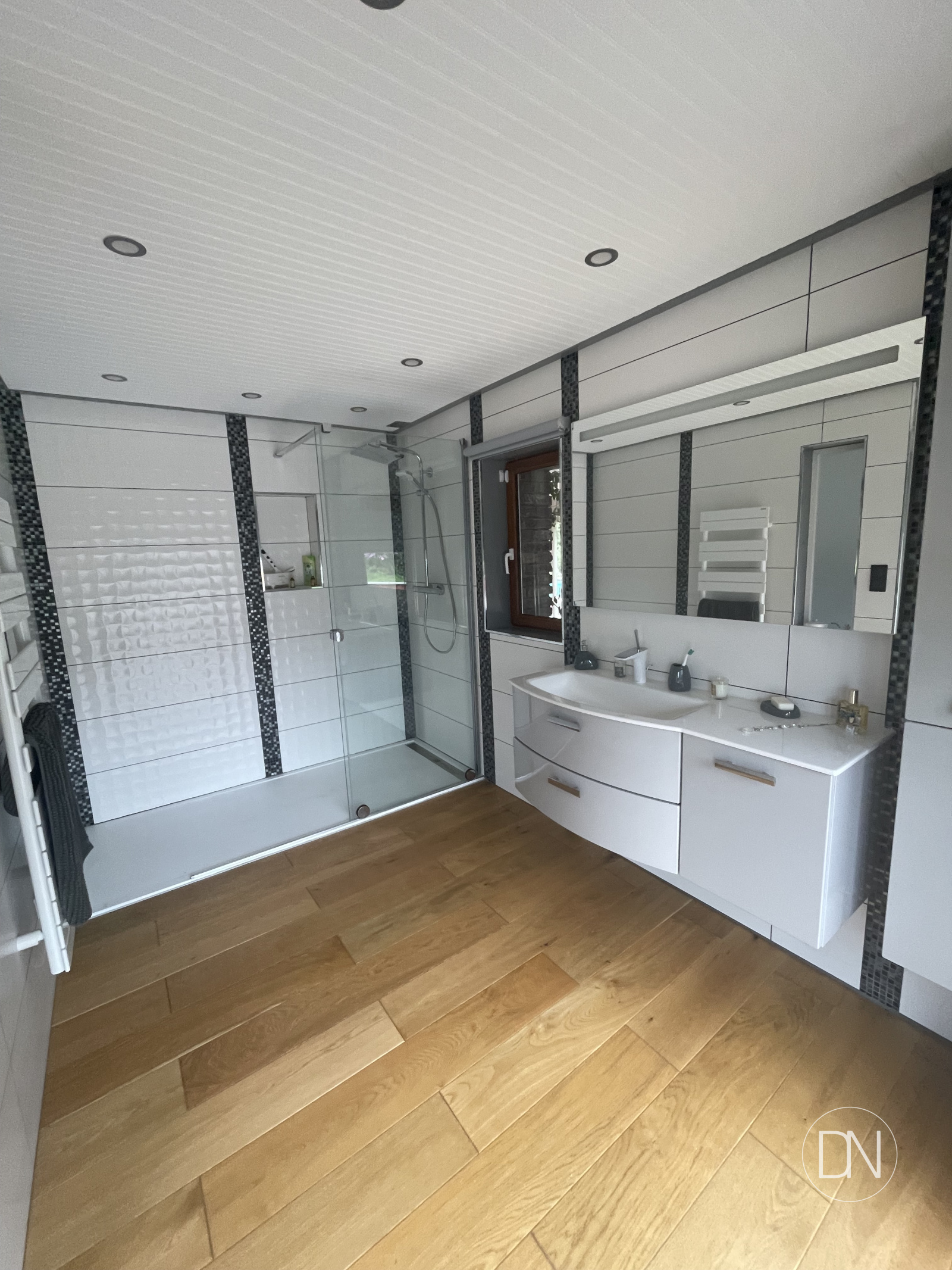 Le rez-de-chaussée, fonctionnel, est complété par une arrière cuisine, une salle de douche avec wc, une spacieuse laverie avec accès extérieur, une chaufferie et un cellier.