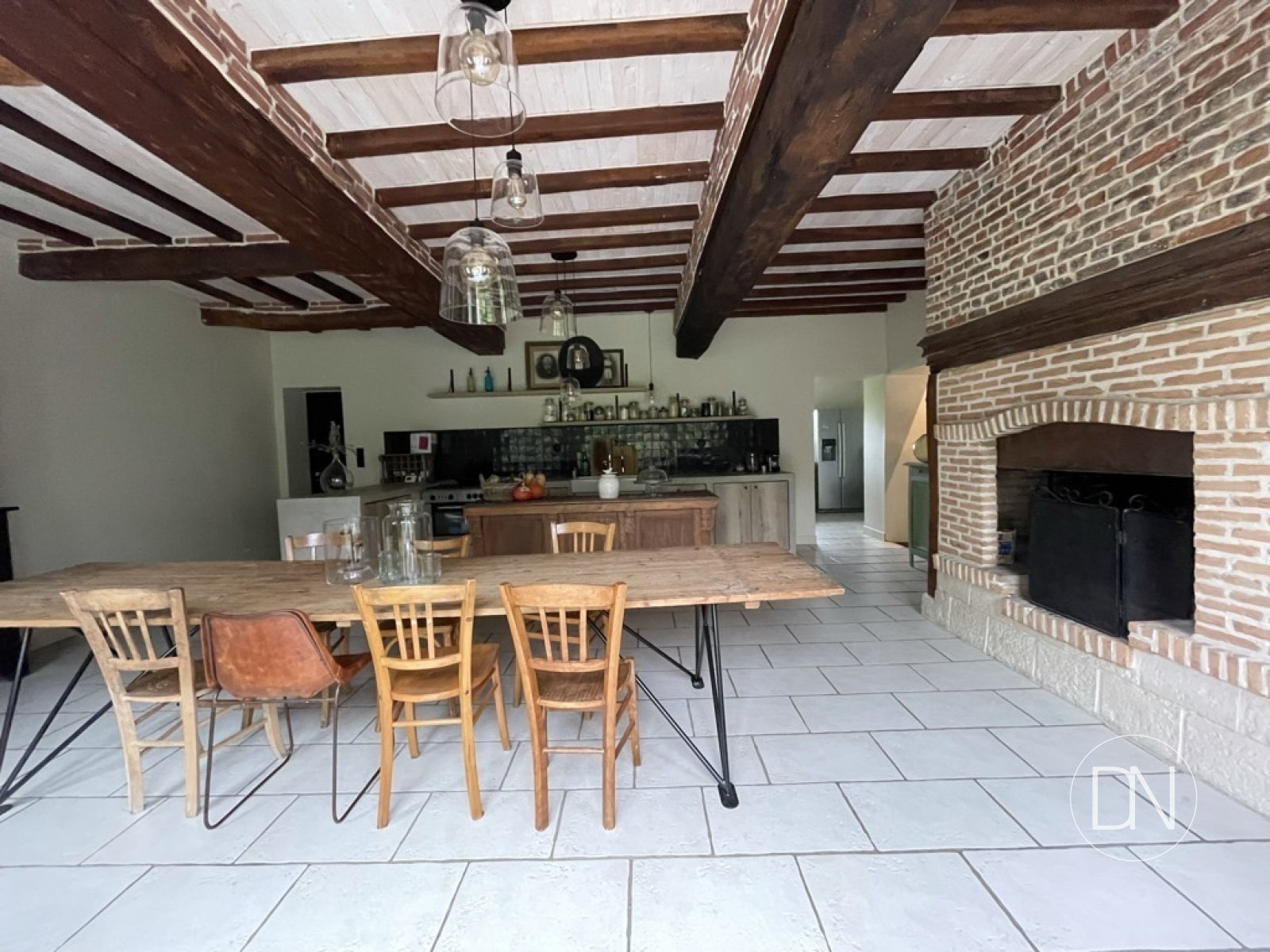 Cuisine aménagée et équipée ouverte sur un espace repas. Accès à une terrasse, carrelage (grés-céramique), cheminée
