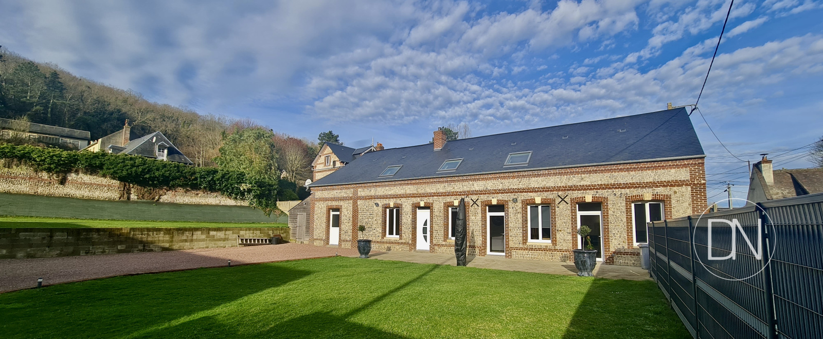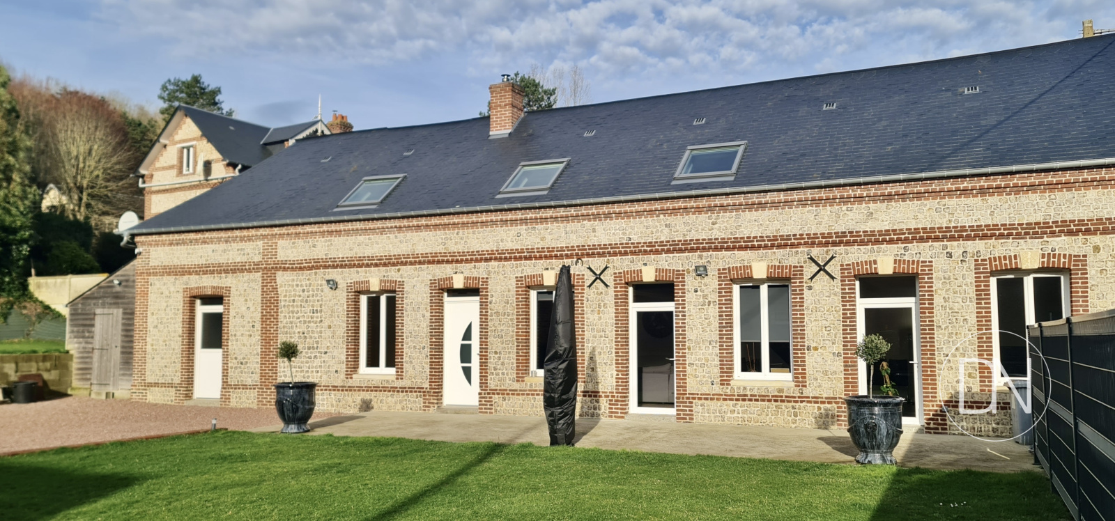À 5 minutes à pieds de la mer, longère de charme, brique et silex, sur 1140 m2 de jardin, les Grandes Dalles, Côte d'Albâtre, Seine-Maritime (76), à vendre.
